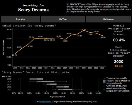A Tableau dashboard examining Google search interest for the term "scary dreams" within the US from 2009 to 2023.